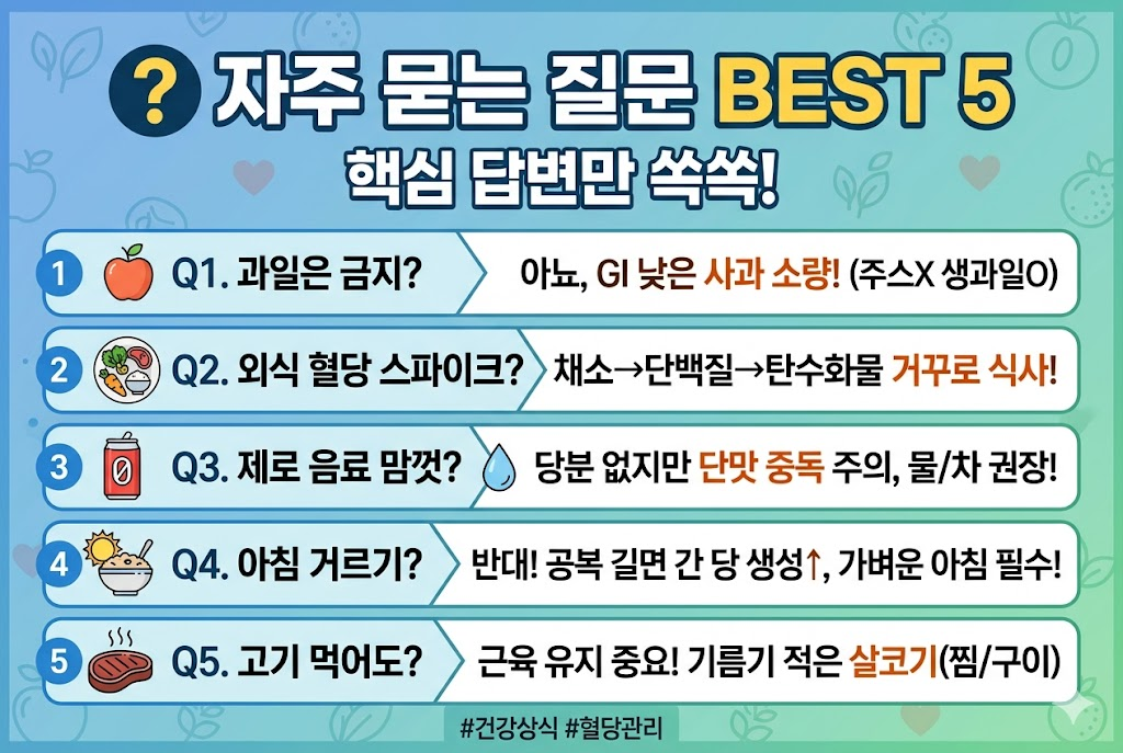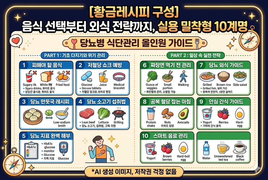 당뇨 관리는 단거리 경주가 아닌 '마라톤'입니다. 본 가이드는 무조건적인 금지보다는 현명한 대체와 상황별 전략에 집중하여, 환자와 가족이 일상에서 자연스럽게 실천할 수 있는 생활 밀착형 콘텐츠를 지향합니다.🟦 PART 1. 기초 다지기와 위기 관리