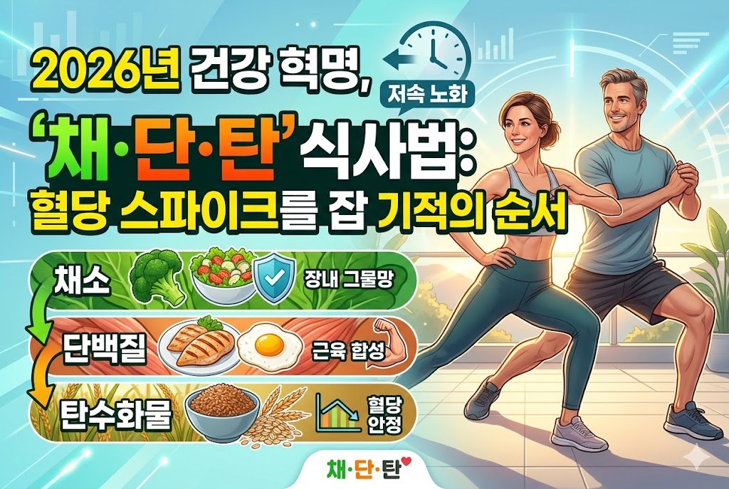 2026년 건강 트렌드의 핵심인 '저속 노화'를 실현하는 가장 강력한 무기는 바로 '채·단·탄(채소-단백질-탄수화물)' 식사법입니다. 식이섬유를 먼저 섭취해 장내 ‘그물망’을 형성함으로써 탄수화물의 당 흡수를 늦추고 혈당 스파이크를 방지하는 이 방식은, 단순한 다이어트를 넘어 노화의 속도를 늦추고 만성 질환을 예방하는 인류 공통의 스마트 식사 지침으로 자리 잡았습니다. 📈
